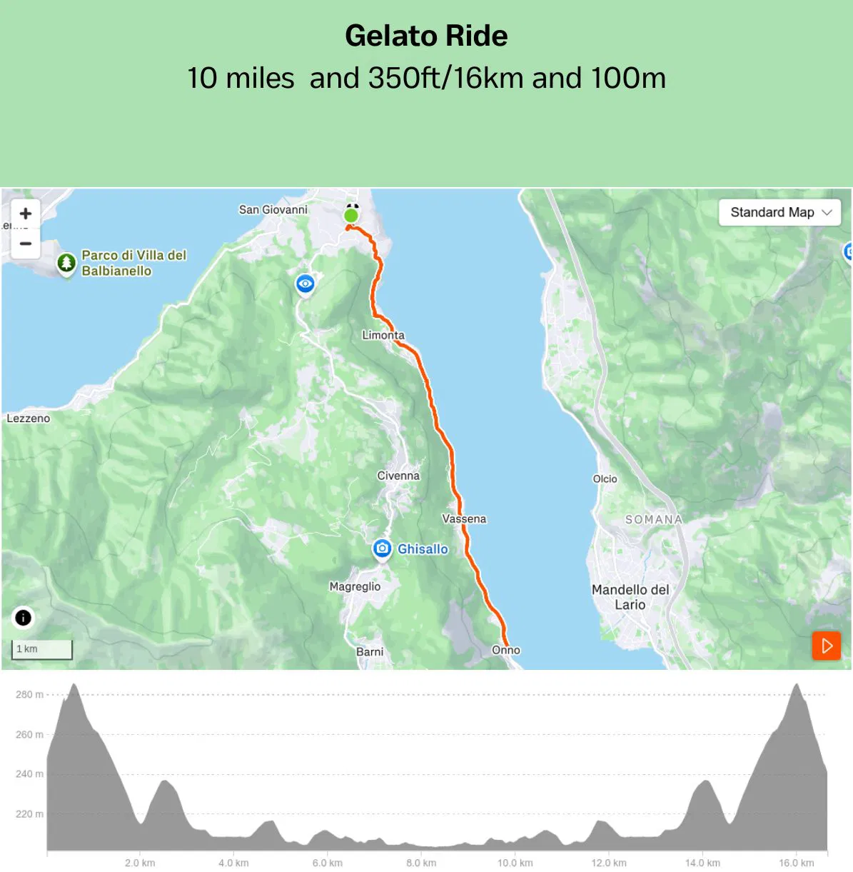 Short spin to shake off the legs. Gelato Ride (10miles and 350ft/16km and 100m).